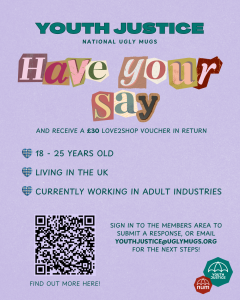 We want to hear from sex workers aged 18-25 based in the UK to help us develop NUM’s advocacy and support programmes. Our Youth Justice workstream aims to improve health, safety, rights and wellbeing for young adults in the industry, ensuring they co-produce and shape change within services that serve them.